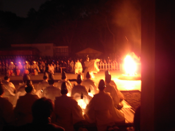 天体の運行と重なり合うよう、ゆっくりと静かに奏される神楽歌の、長くそして深く響く雅楽の音と、高く低くうねる様な唱和に包まれて、松明の炎に揺らめく巫女の黄金色の天冠や鈴を見つめるうち、漆黒の天空にチカと光るそれは、燃え上がる松明の火の粉なのか、はたまた夜空に浮かぶ星明かりなのか、ぼんやりとして、自分の居るこの場もどこか違う場へ移ったかのように思え、ただただその悠々とした時間のなかに浸っていました。