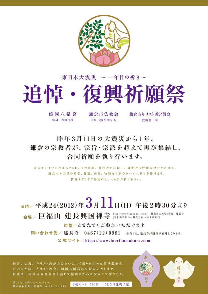 ボンズ:日頃からそういう繋がりがあったために、3.11の後、鎌倉では一緒に祈ろうという気運が生まれたのかもしれないですね…* *2011年3月11日に起きた東日本大震災。その1ヶ月後の4月11日に、鶴岡八幡宮では神道・仏教・キリスト教の宗教者たちが宗教の壁も宗派の壁も超えて集い、追善供養と復興祈願のお祈りを捧げました。その後も毎年3月11日に、2012年は建長寺で、2013年は雪ノ下教会で、2014年は再び鶴岡八幡宮で行われ、市民もボランティアでお手伝いをしています。