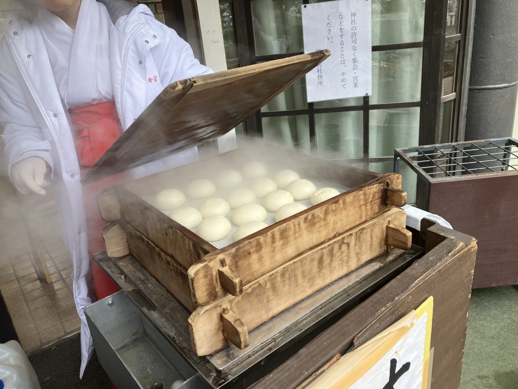 お参りを終えて本殿前の階段を下っていると、目に入ってきたのは、境内で蒸されているお饅頭!すーっと吸い寄せられて、