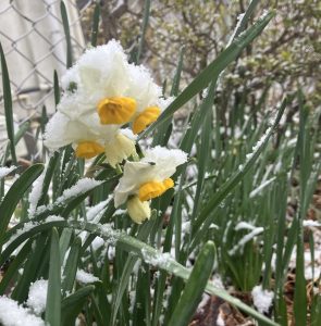 昨日からチラチラ降ったりやんだりしていた雪が、今朝はうっすら積もって雪景色になりました。